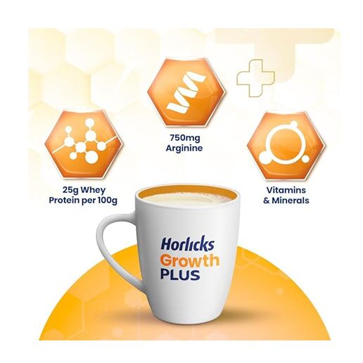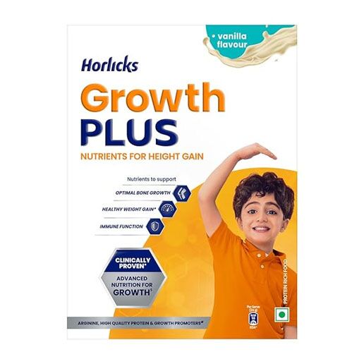 - Horlicks Growth Plus contains 100% of your child’s daily requirement of Protein as well as Arginine and other growth-promoting nutrients such as Calcium and Vitamin D that support optimal bone growth
